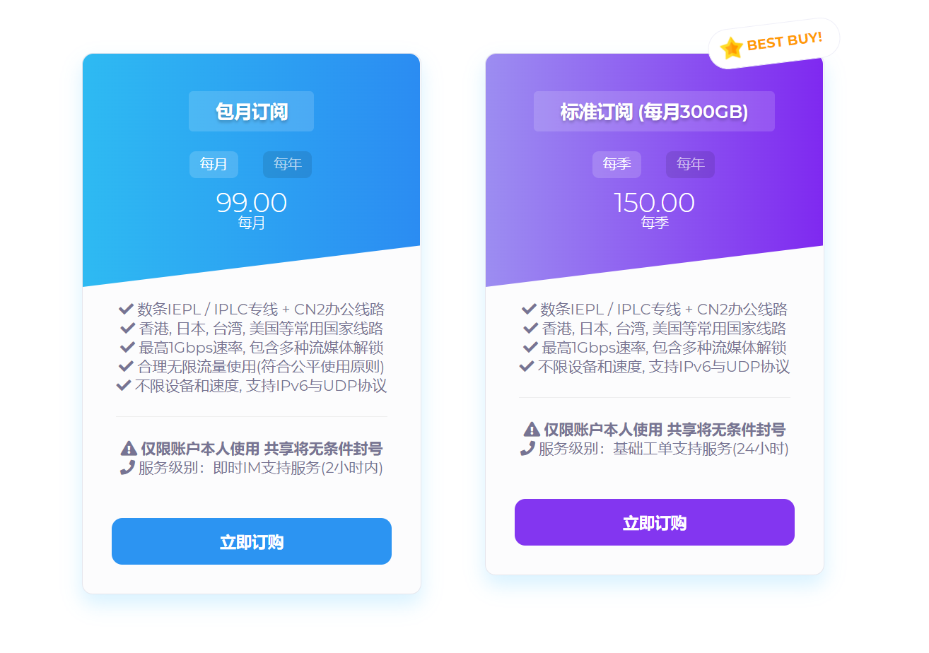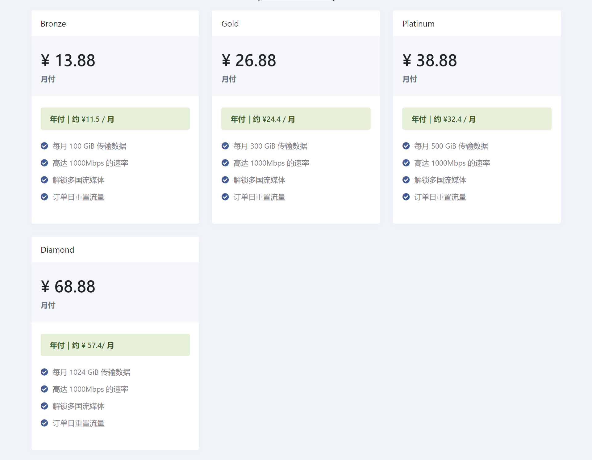套餐设置十分简单,不同套餐仅有价格、流量区别,可用节点都是一样的。