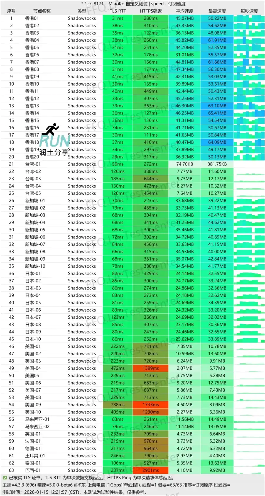 单线程测速,更贴合日常使用。常用五大地区节点多数表现尚可,美国、台湾方向节点带宽似乎不太足。另外,节点落地复用较多,约等于每个地区实际是一个节点,官方「黑科技」手搓的超多节点。