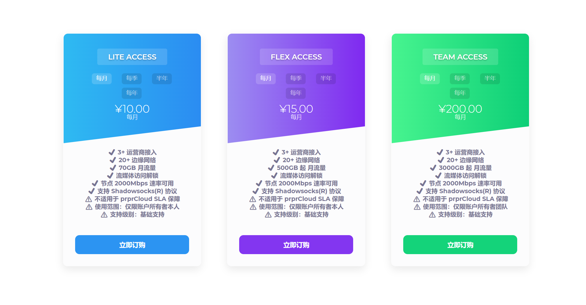 prprCloud 分为三类,支持月付。轻度用户使用LITE ACCESS 套餐,一般翻墙用户使用FLEX ACCESS套餐,企业用户使用TEAM ACCESS套餐。
