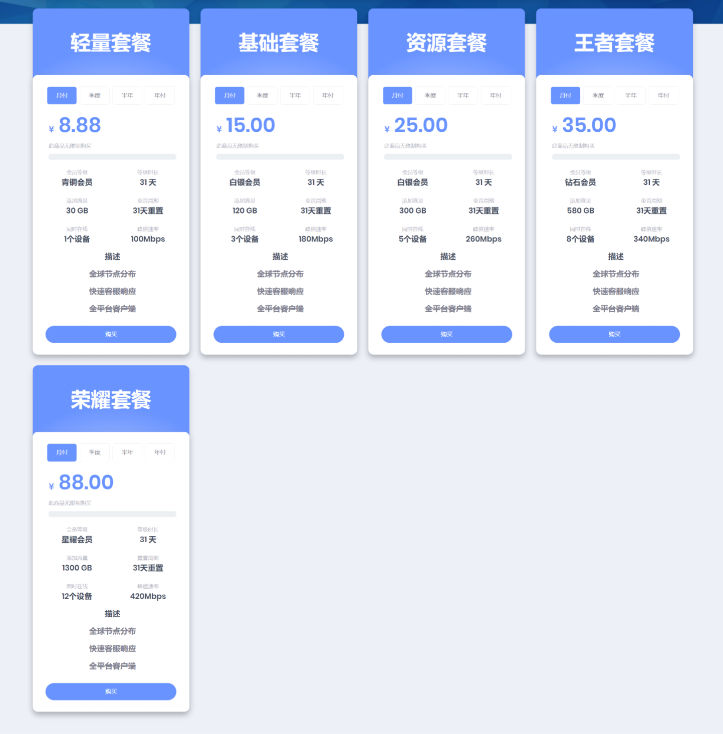 - 轻量套餐:月付8.88,30G流量,最多1个设备在线,限速100Mbps。