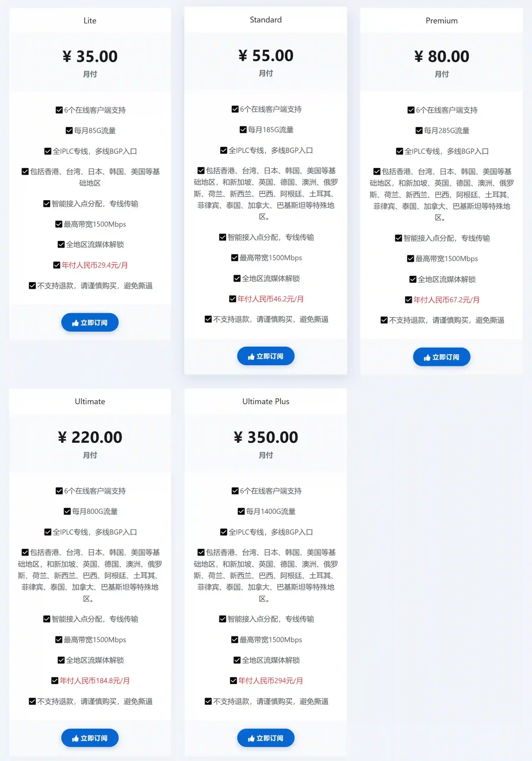 - Ultimate plus:¥350/月,1400G流量。