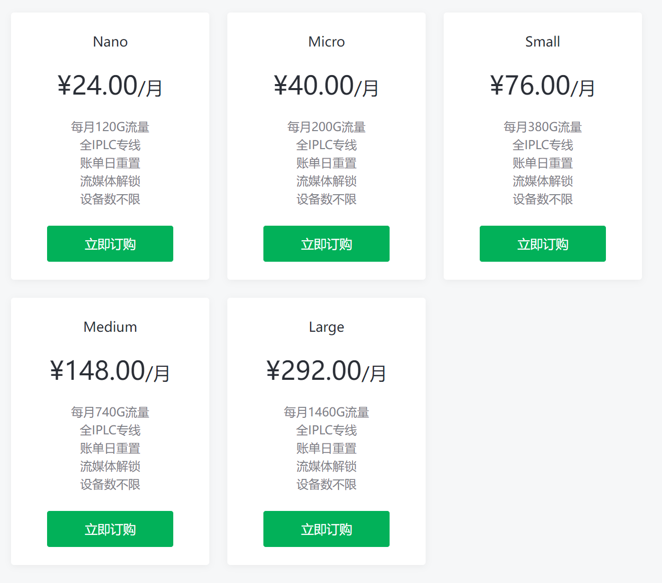 优质专线:月付:¥59/月,140G流量/月。季付:¥177/季,210G流量/月。年付:¥708/年,280G流量/月。
