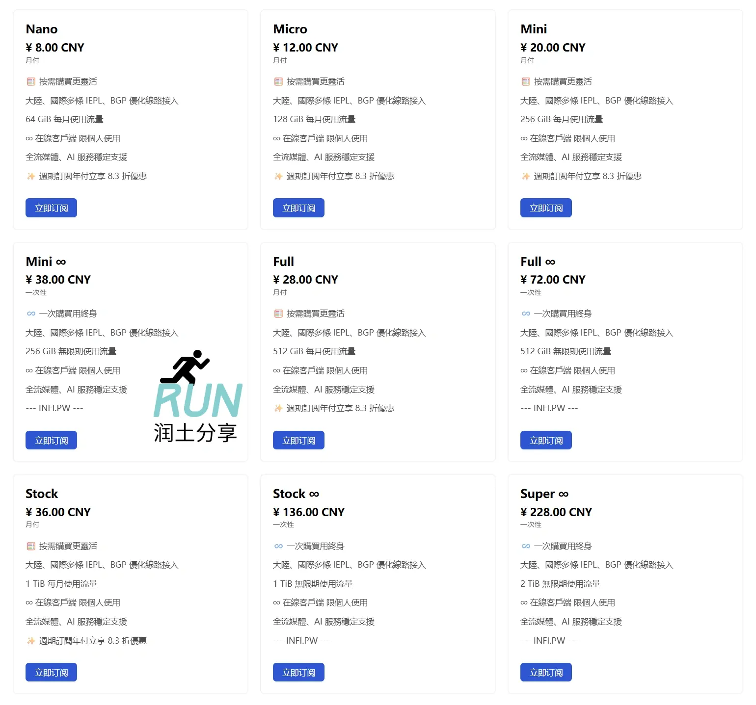 infiniport机场支持月付,最低仅需¥6/月,涨价了,目前最低 ¥8/月。也有不限时长按量付费流量包套餐。