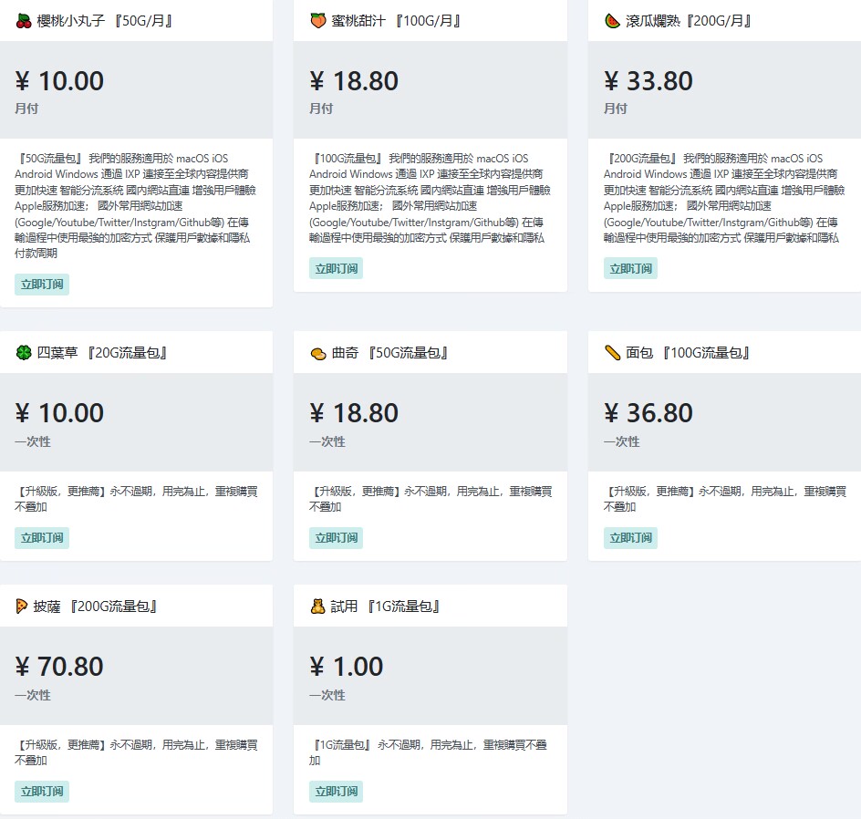 小狗云机场支持月付,也有一次性的按量付费流量包。