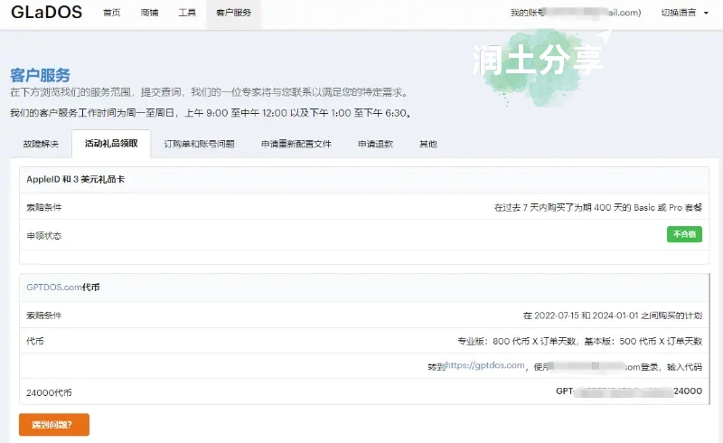 另外,购买GLaDOS的机场服务,也会给你赠送 Token,Basic套餐赠送500 X 订单天数,Pro套餐赠送800 X 订单天数。GLaDOS 机场会给到一个 GPTDOS 的兑换码,自己到GPTDOS里的 Code 页面下去兑换即可。