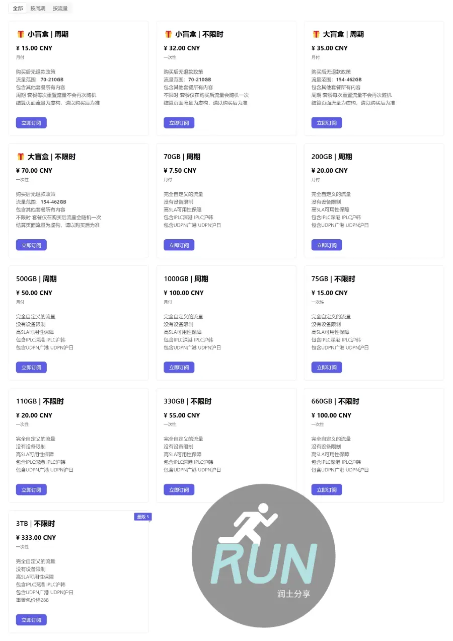 - 月付,¥100/月,1000G流量/月。